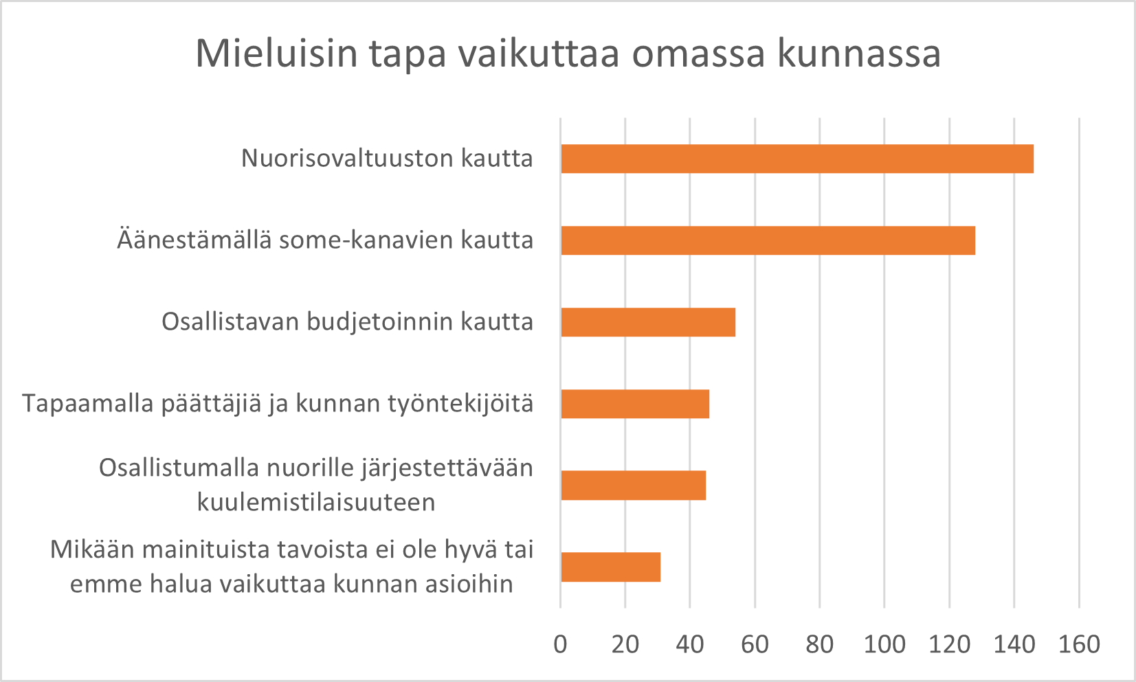 Alustavassa tarkastelussa on käynyt ilmi, että Keski-Suomen kuntien verkkosivuilla ei juurikaan näy nuorten vaikuttamisen mahdollisuudet tai siellä ei tehdä näkyväksi nuorten ja päättäjien vuoropuhelua. Tällä hetkellä tarjolla oleva tieto on hajanaista ja tarkastelun myötä heräsi huoli, että oletetaanko nuoren jo tietävän mahdollisuuksistaan osallistua. Onneksi useammassa kunnassa kuitenkin viestejä vaikuttamisryhmiin osallistumisesta lähetetään esimerkiksi koulun viestintäkanavia pitkin sekä tietysti kohtaamalla nuoria. Arvioimme kuitenkin, että kaikki osapuolet hyötyisivät, jos lasten ja nuorten osallisuuteen ja vaikuttamisen mahdollisuuksiin liittyvä tieto löytyisi keskitetysti ja selkeästi yhdestä paikasta kuntakohtaisesti. Samassa yhteydessä tulisi avata eri vaikuttajaryhmien toimintaa, kertoa miten pääsee mukaan ja muistuttaa nuoria, siitä että kaikki ovat tervetulleita osallistumaan taustaan tai aiempaan kokemukseen katsomatta. Nuorten lisäksi näistä tiedoista hyötyisi myös kuntien valmistelevat virkamiehet, kehittäjät ja muut työntekijät sekä luottamushenkilöt.