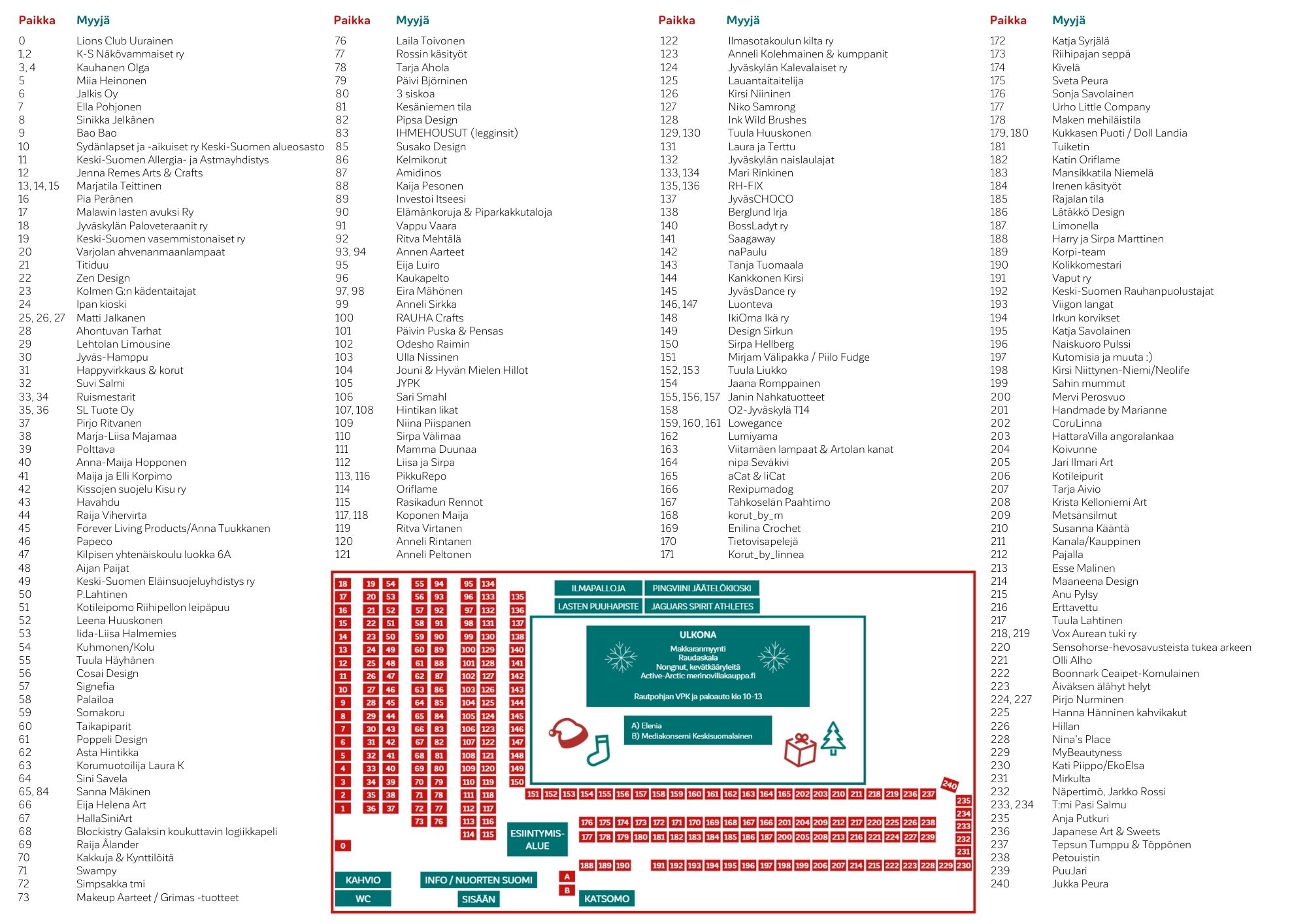 | 215 | Anu Pylsy | Anun myyntipöydältä löytyy havuista ja kävyistä valmistettuja kransseja, havukieppejä, risukuusia sekä hahtuvaenkeleitä & kennokynttilöitä ym. |