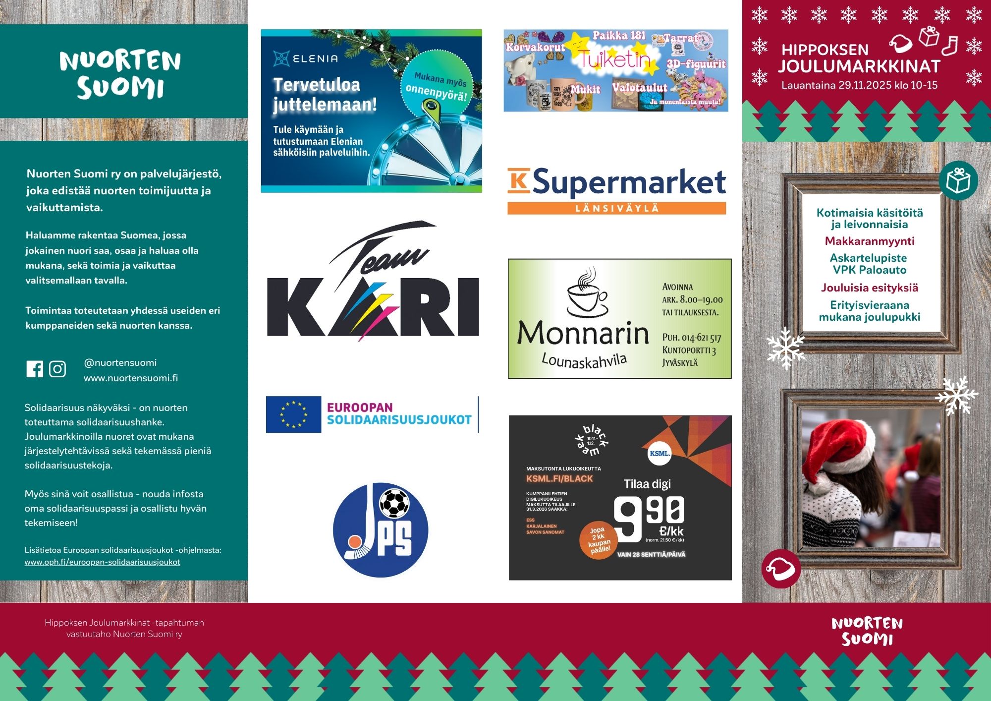 Hippoksen Joulumarkkinat on Nuorten Suomi ry:lle tärkeä varainhankintatapahtuma, jonka tuotto mahdollistaa nuorten toimijuuden tukemisen. Tervetuloa!
