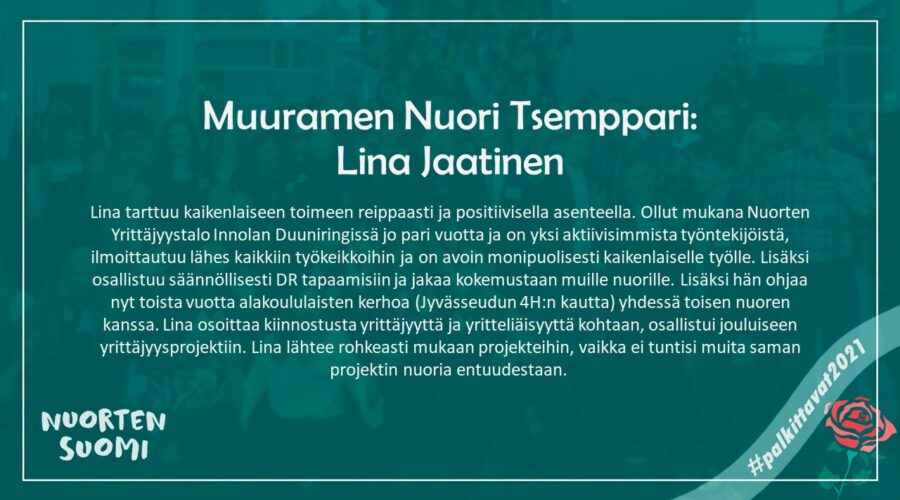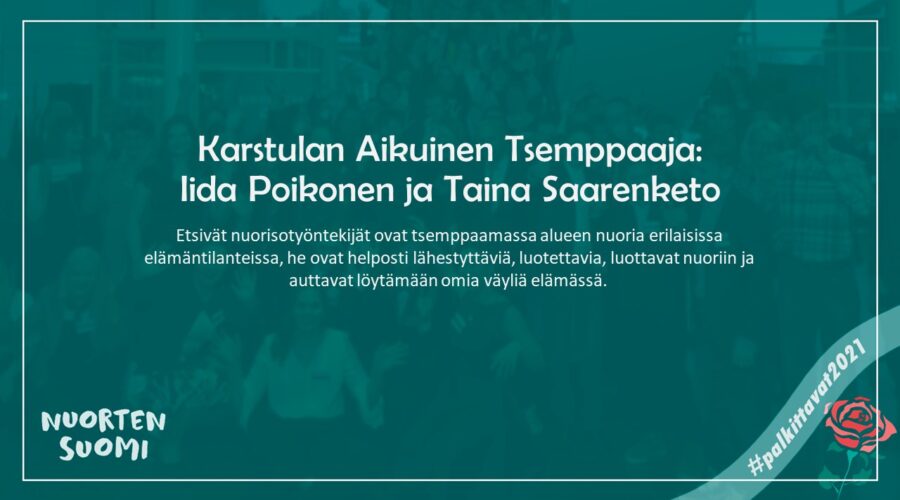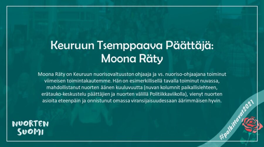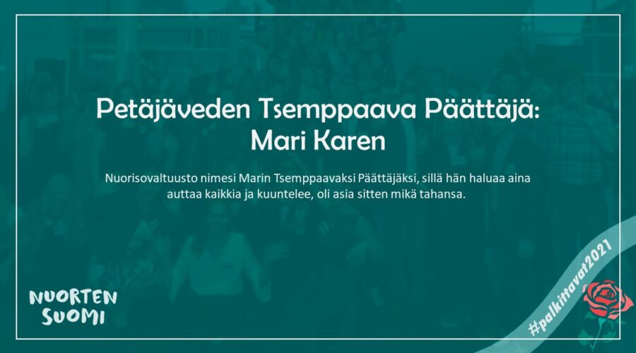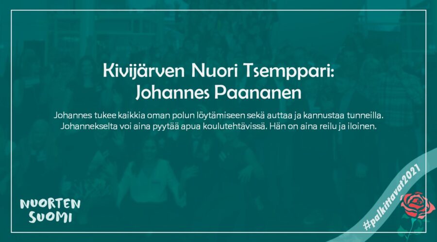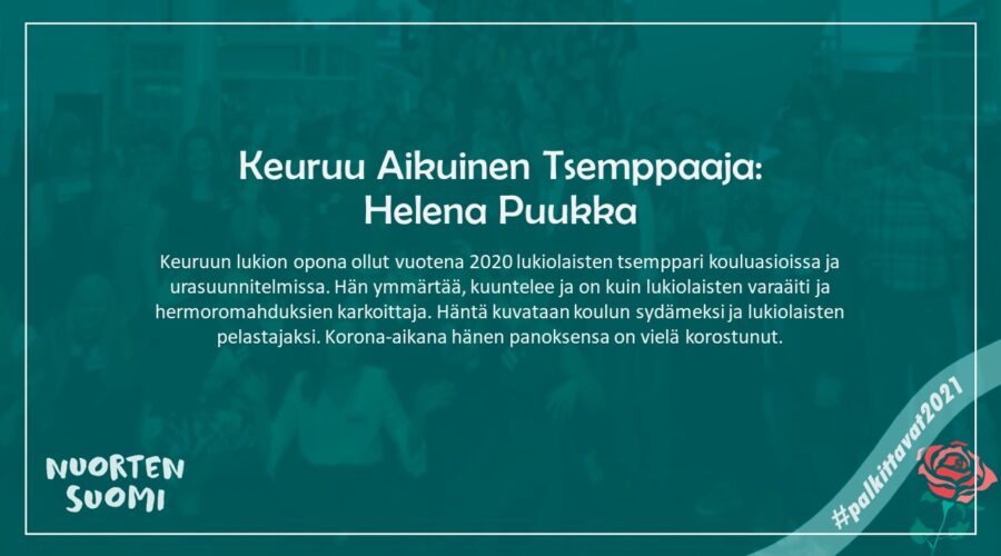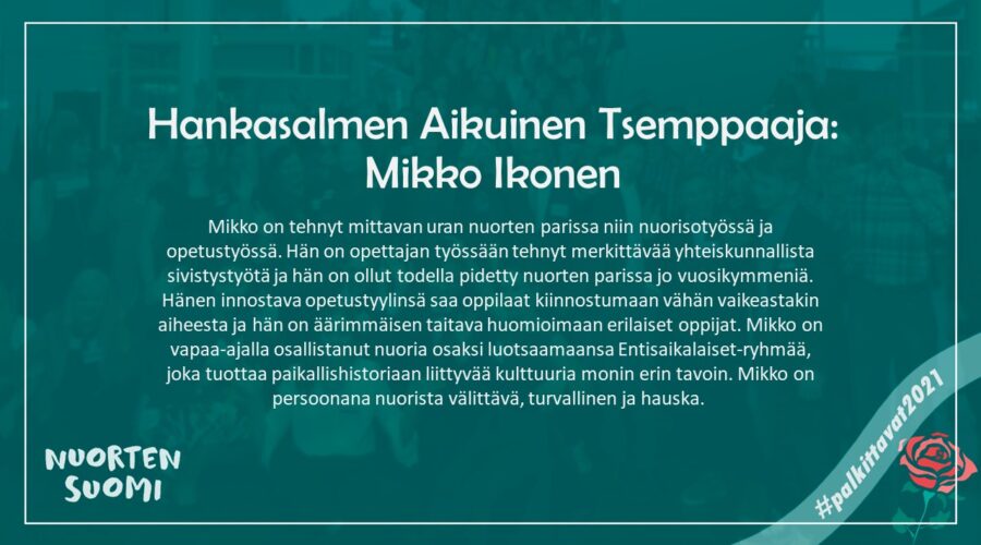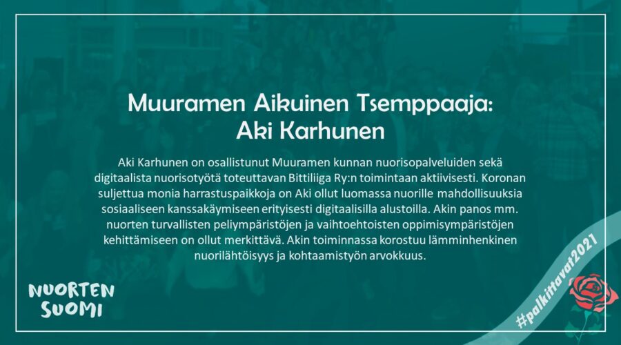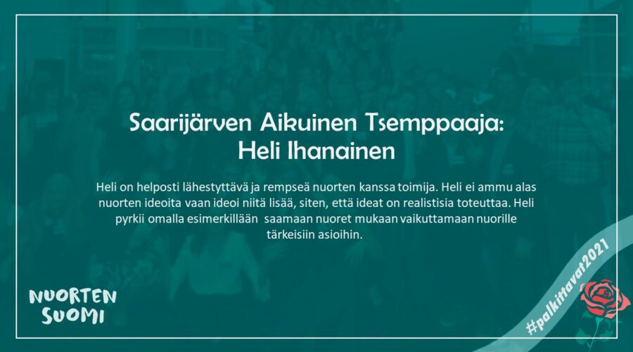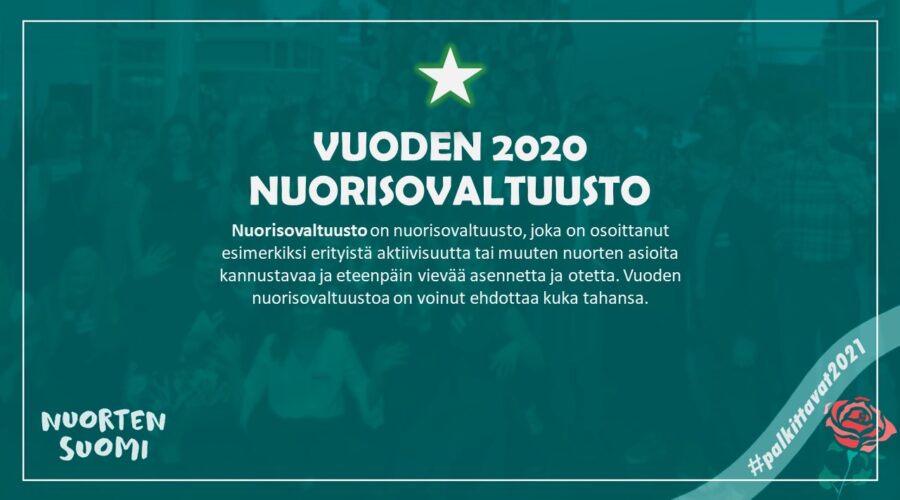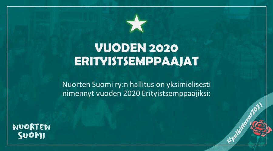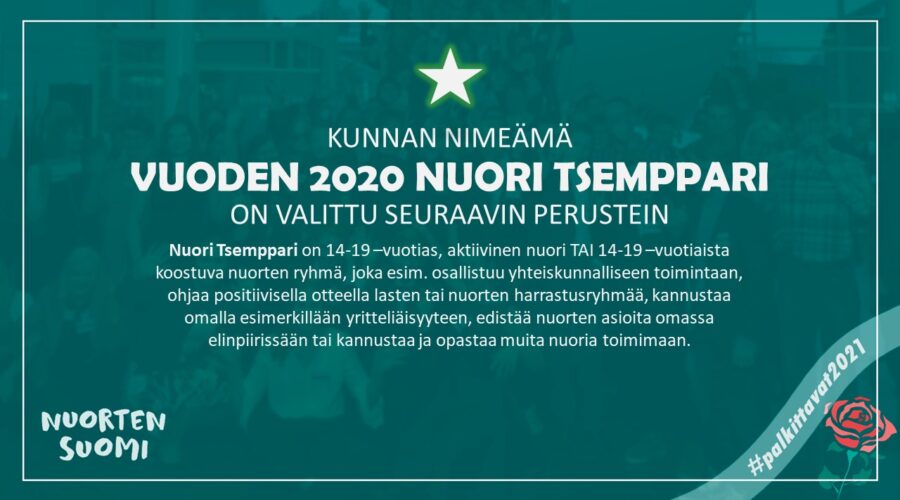Tahdoimme kuitenkin nostaa jo keväällä palkittavien aktiivisuutta ja tsemppaavaa asennetta esiin, joten somekanavillamme juhlistettiin palkittavia maalis-huhtikuussa #palkittavat2021-somekampanjan avulla. Kampanjan aikana julkaisimme palkittavat, sekä heidän lähettämiään terveisiä ja kuvia instagramissa ja facebookissa. Julkaisut ovat yhä nähtävillä somekanavillamme! Instagramista löydymme nimellä @nuortensuomi, ja facebook-sivulle pääset TÄSTÄ.