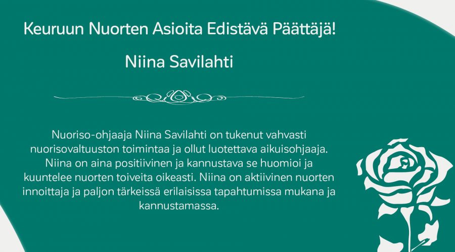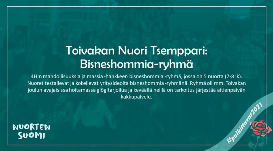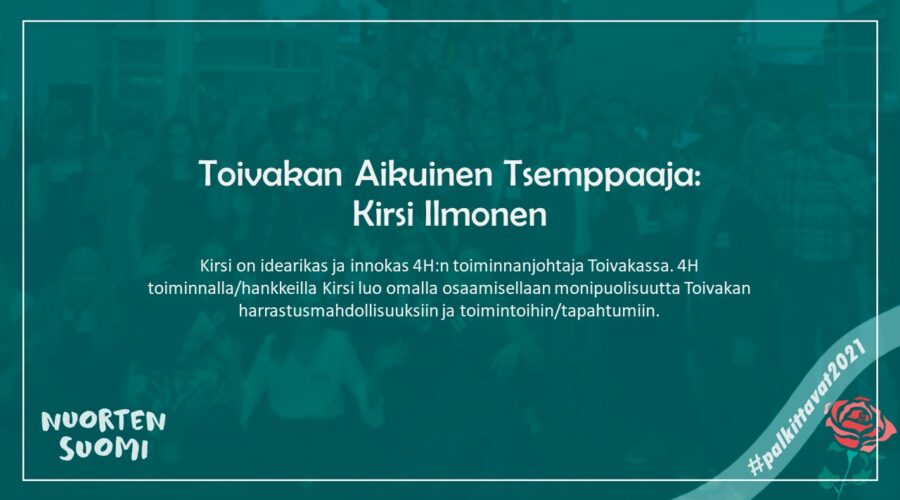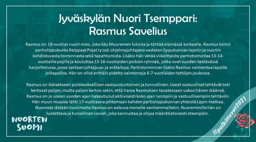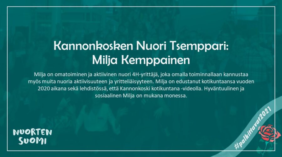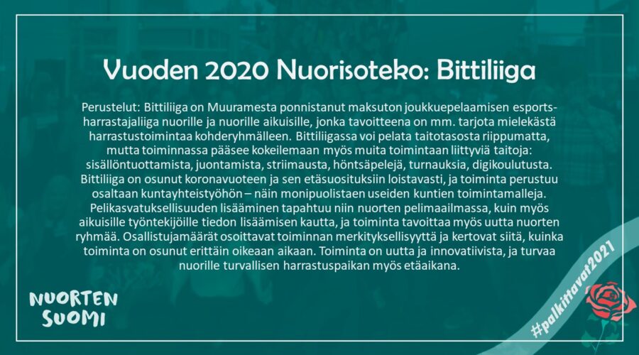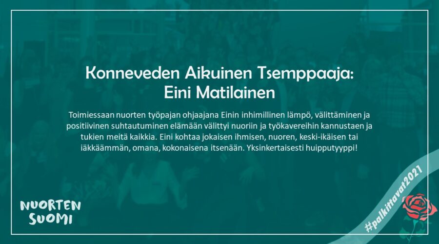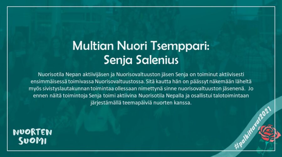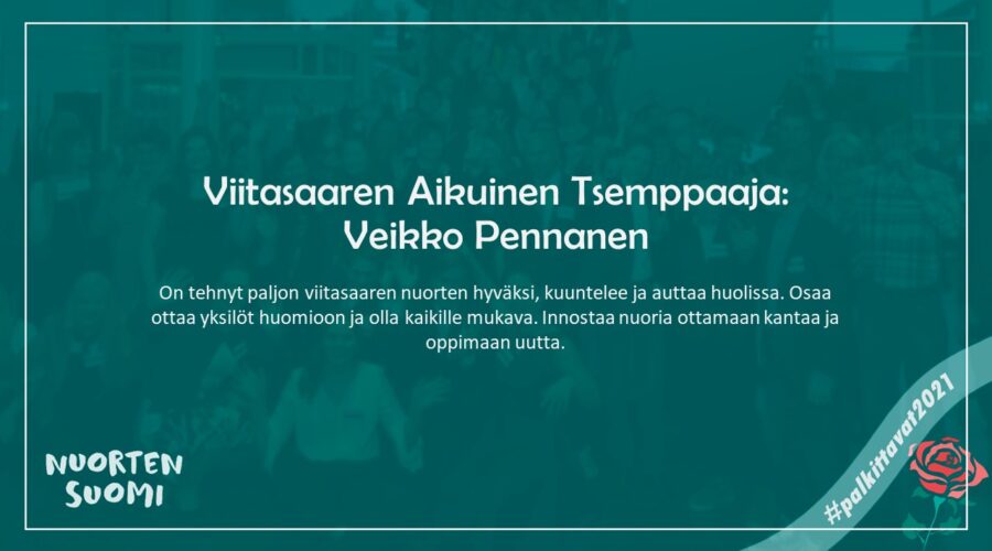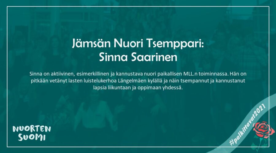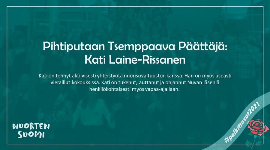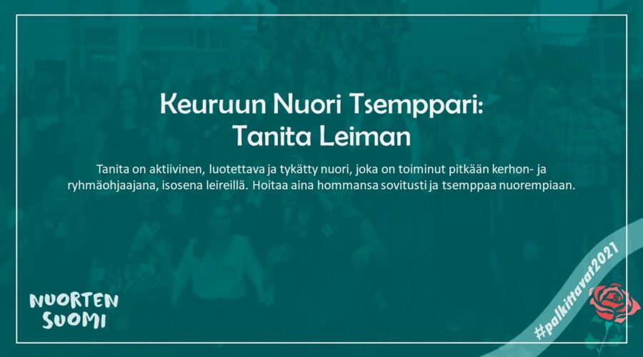Tahdoimme kuitenkin nostaa jo keväällä palkittavien aktiivisuutta ja tsemppaavaa asennetta esiin, joten somekanavillamme juhlistettiin palkittavia maalis-huhtikuussa #palkittavat2021-somekampanjan avulla. Kampanjan aikana julkaisimme palkittavat, sekä heidän lähettämiään terveisiä ja kuvia instagramissa ja facebookissa. Julkaisut ovat yhä nähtävillä somekanavillamme! Instagramista löydymme nimellä @nuortensuomi, ja facebook-sivulle pääset TÄSTÄ.