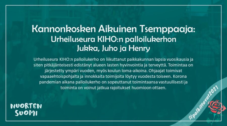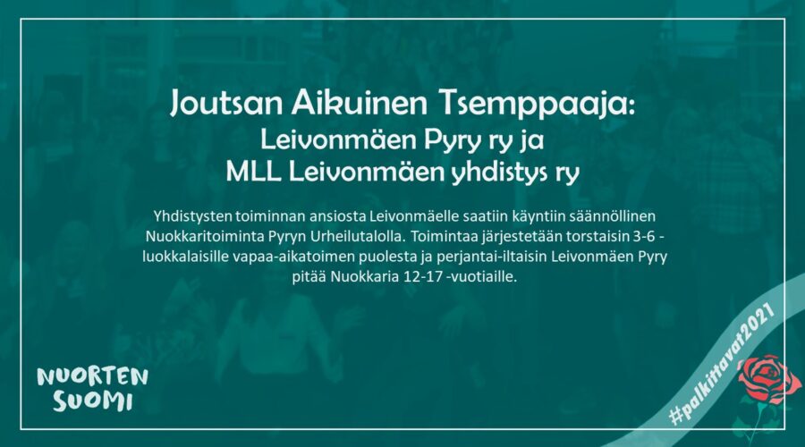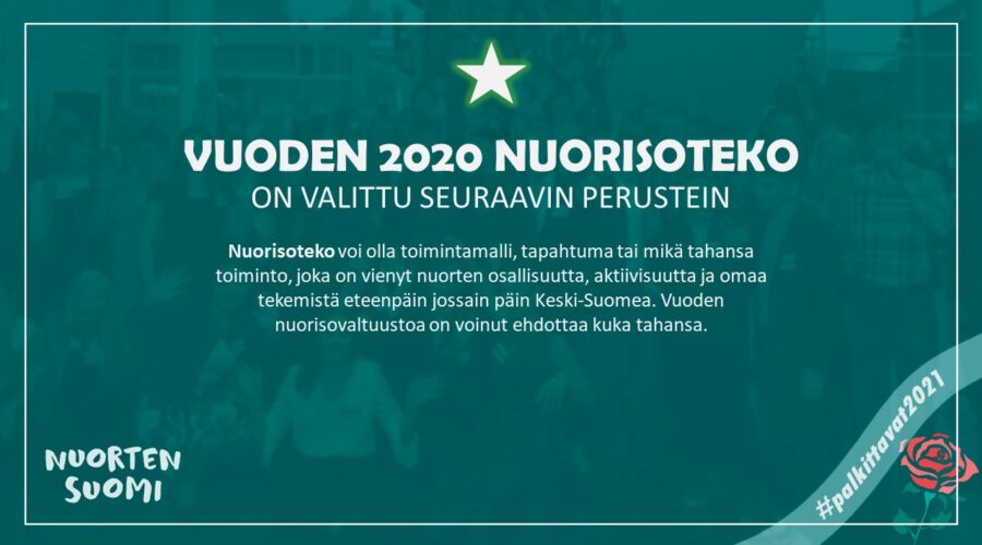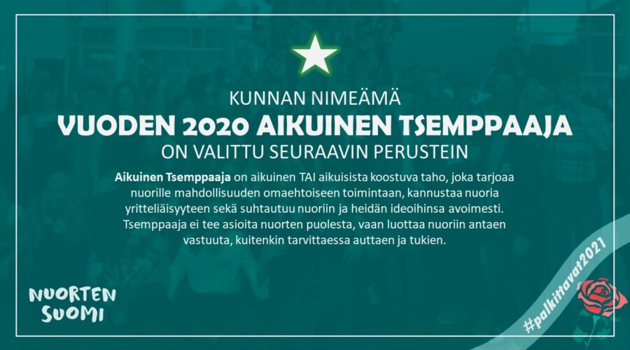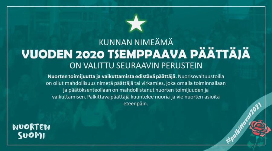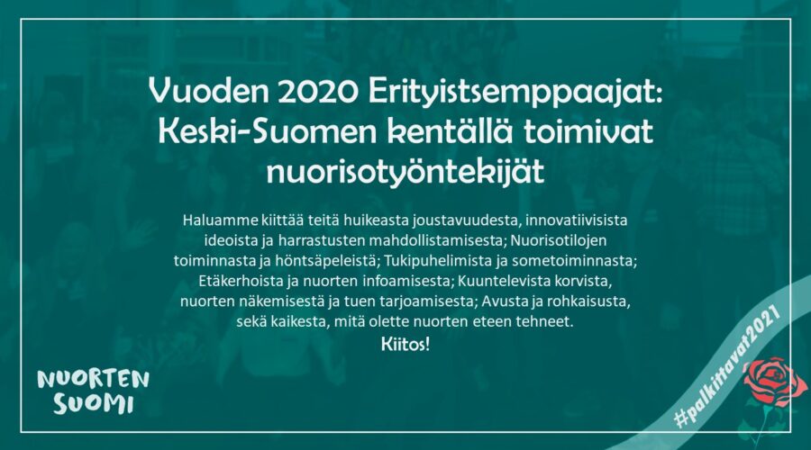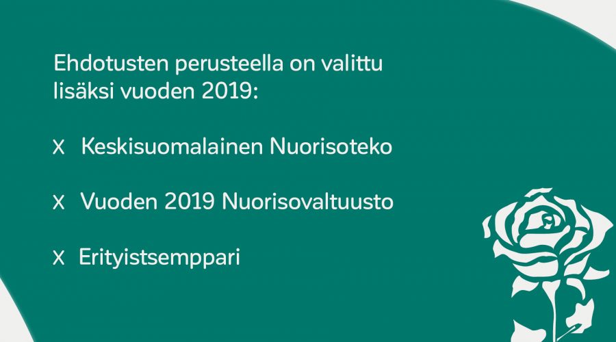Ehdotusten perusteella on palkittu myös Erityistsemppaajat, Nuorisovaltuusto sekä Nuorisoteko, joita on saanut ehdottaa kuka vain.