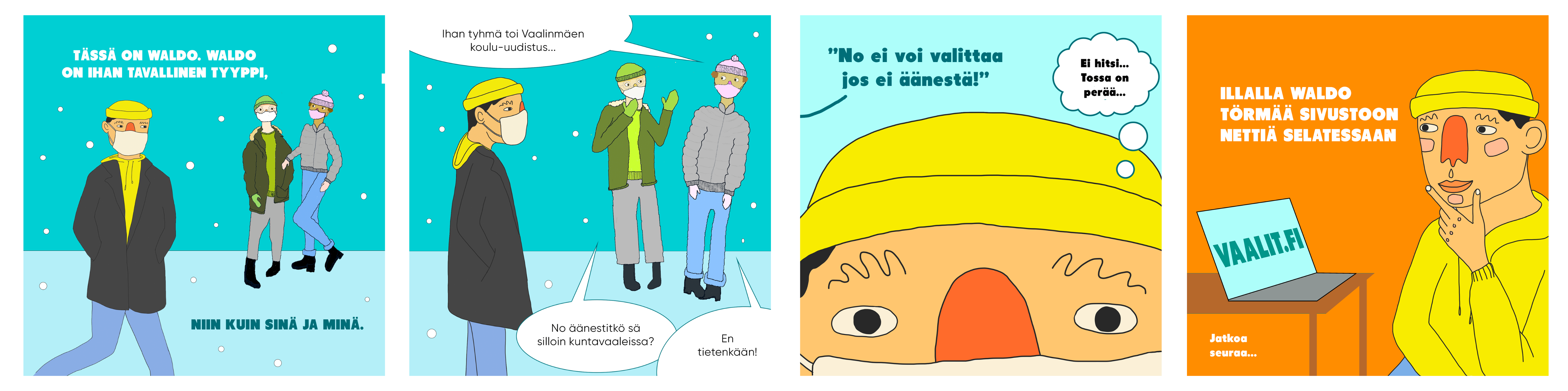 Nuorten Suomen vapaaehtoisista koostuva joukko sai rahoituksen Euroopan solidaarisuusjoukoilta ja tuotti sen turvin kahdeksan strippiä suomeksi, ruotsiksi, englanniksi, saksaksi, ranskaksi, espanjaksi ja venäjäksi. Sarjakuvien aiheet käsittelevät muun muassa sitä, kuka on äänioikeutettu, miten äänestäminen käytännössä tapahtuu, ja mistä saa lisää tietoa. Strippien välityksellä haluttiin lisätä kiinnostusta kuntavaaleihin ja vaikuttamiseen kuvituksen ja kielen keinoin.