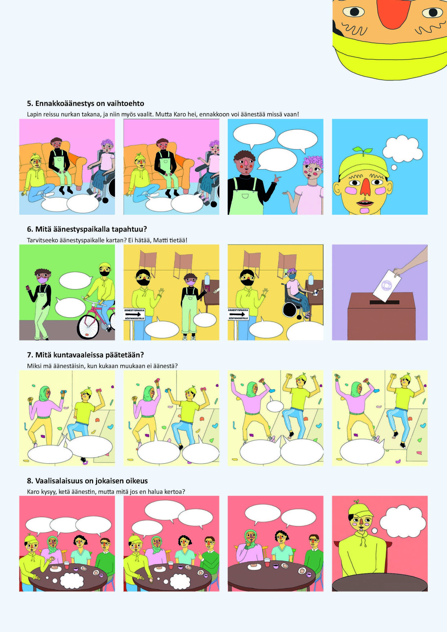 Nuorten Suomen vapaaehtoisista koostuva joukko sai rahoituksen Euroopan solidaarisuusjoukoilta ja tuotti sen turvin kahdeksan strippiä suomeksi, ruotsiksi, englanniksi, saksaksi, ranskaksi, espanjaksi ja venäjäksi. Sarjakuvien aiheet käsittelevät muun muassa sitä, kuka on äänioikeutettu, miten äänestäminen käytännössä tapahtuu, ja mistä saa lisää tietoa. Strippien välityksellä haluttiin lisätä kiinnostusta kuntavaaleihin ja vaikuttamiseen kuvituksen ja kielen keinoin.
